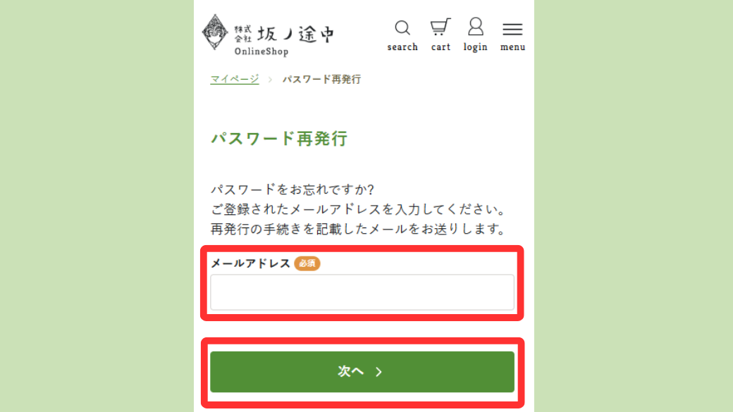 1.[パスワード再発行ページ]でメールアドレスを入力して[次へ]をクリック